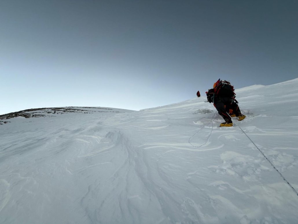 Great team work. We stuck it out over a week past the end of our expedition end date to wait out the storm, the high winds. Our Sherpa team led the way up the route today and broke trail and help fix lines to make it climbable for us.